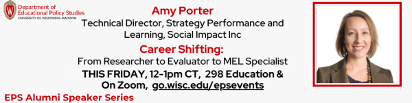 EPS Alumni Speaker Series: “Career Shifting: From Researcher to Evaluator to MEL Specialist” by Amy Porter, Technical Director, Strategy Performance and Learning, Social Impact Inc